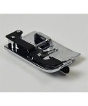 This foot has a metal guide in the center and three grooves on the underside. during blind hemming, the fold of the fabric fits snugle against the guide in the foot for accuracy while the grooves underneath help to prevent unnecessary slipping. The needle swings over the metal guide creating slack in the upper tension so that the pick of hte stitch is almost invisible.